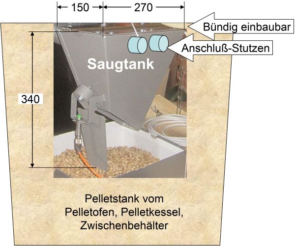 Saugtank für Pelletöfen, Pelletkessel und Zwischenlager. für alle Pellet-Kessel und Pellet-Öfen, dessen Tagesbehälter mit offenem Deckel betrieben werden darf. Nutzvolumen ca. 3 Liter, maximal 2 kg pro Saugvorgang. Nicht im Lieferumfang enthalten: Sensor und Sensorleitung.